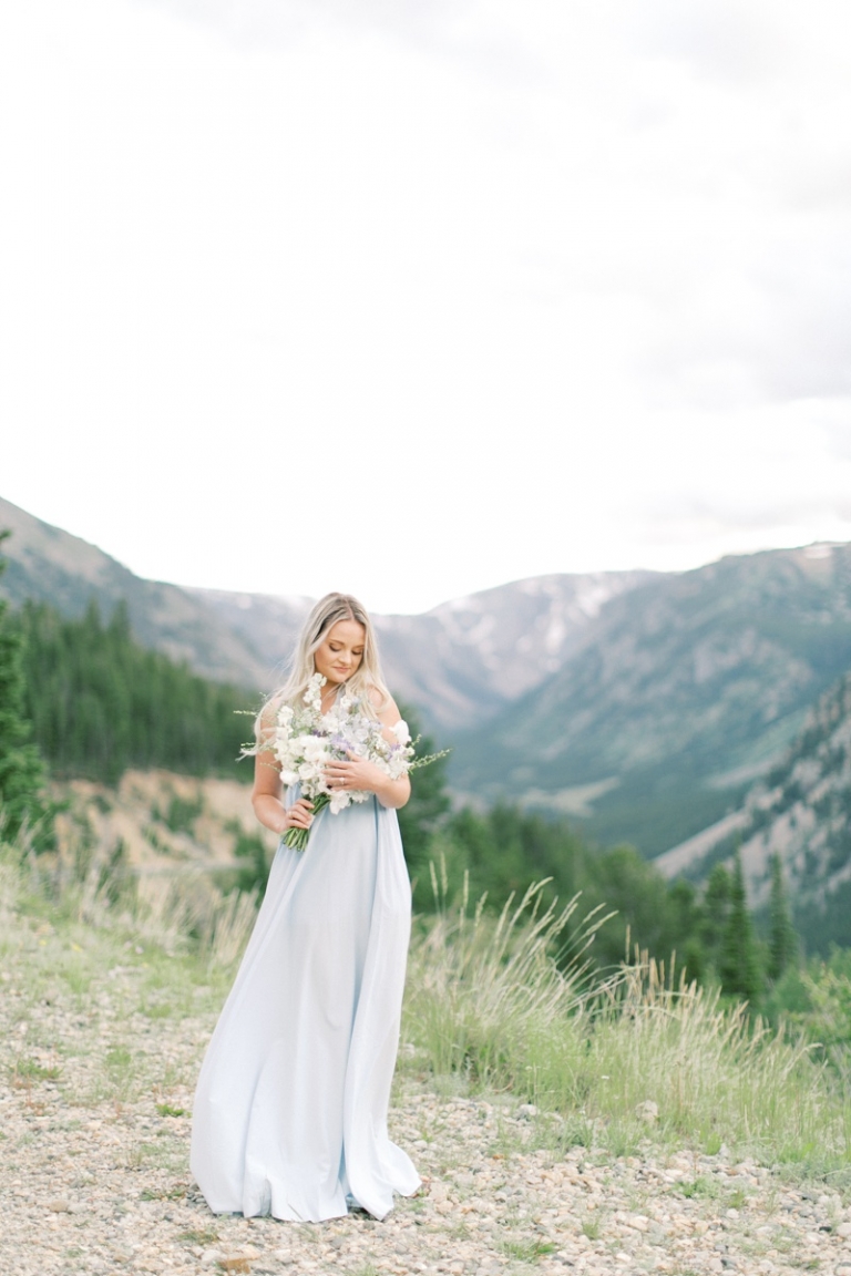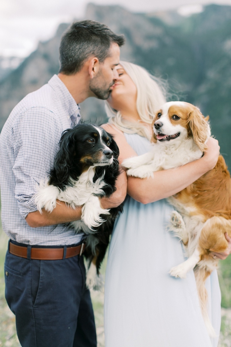 Beth and Jake drove up from their home in Billings, MT for their engagement session on the Beartooth Pass outside of Red Lodge. They brought their two dogs with them and we made sure to get some photos of the whole family! Beth’s bouquet was from Rowan and Larch Floral Design and it added the perfect pop of color with her dress.