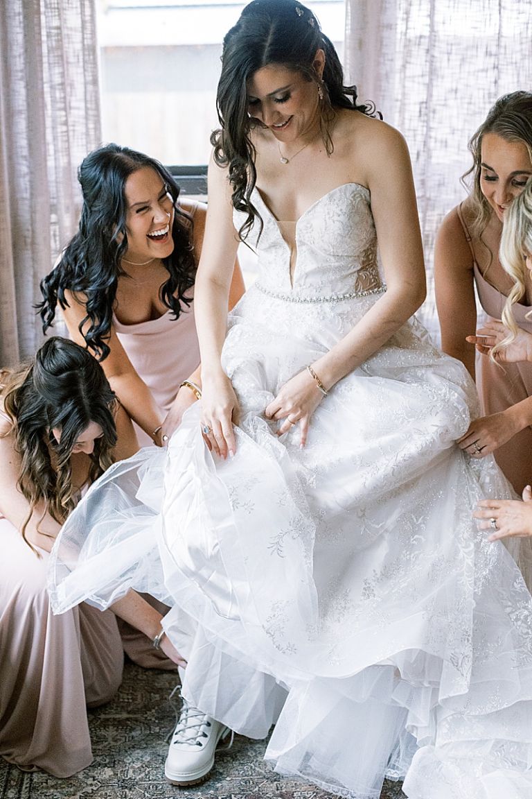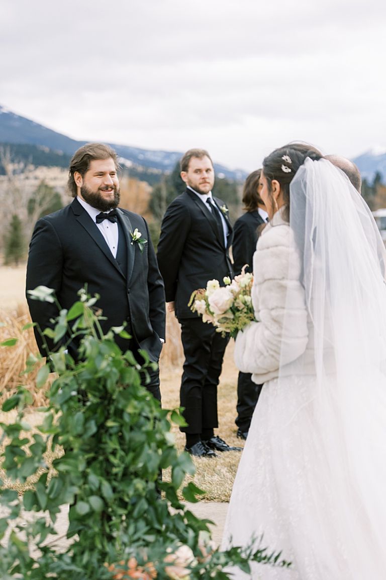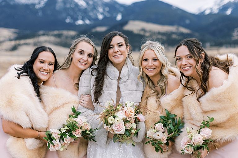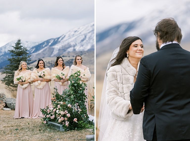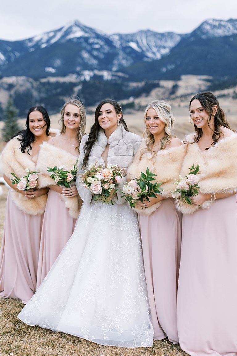While snow-capped the surrounding peaks, the venue itself remained snow-free, creating a unique winter landscape. Taylor looked radiant in her elegant gown, accented with a fur coat for warmth. Her bridesmaids wore fur shawls and snow boots, blending chic style with practicality for the crisp Montana air.