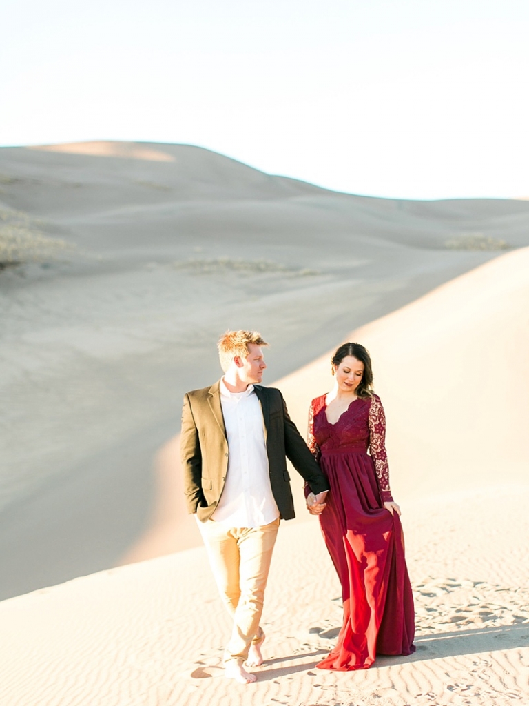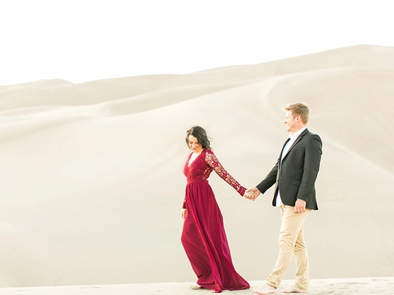Shelby and Caleb had such an amazing anniversary session at the Great Sand Dunes National Park in Colorado. I had never been and was dying to photograph here. As we drove closer to the park, we began to see massive sand dunes sitting just at the base of the mountains behind it. To me, it was truly an amazing phenomenon to see these dunes in the middle of nowhere. Although sand dunes in the middle of the Colorado mountains isn’t common, it is definitely beautiful. We had a small hike into the dunes with just a small glow of sun left peaking over dunes to the west.