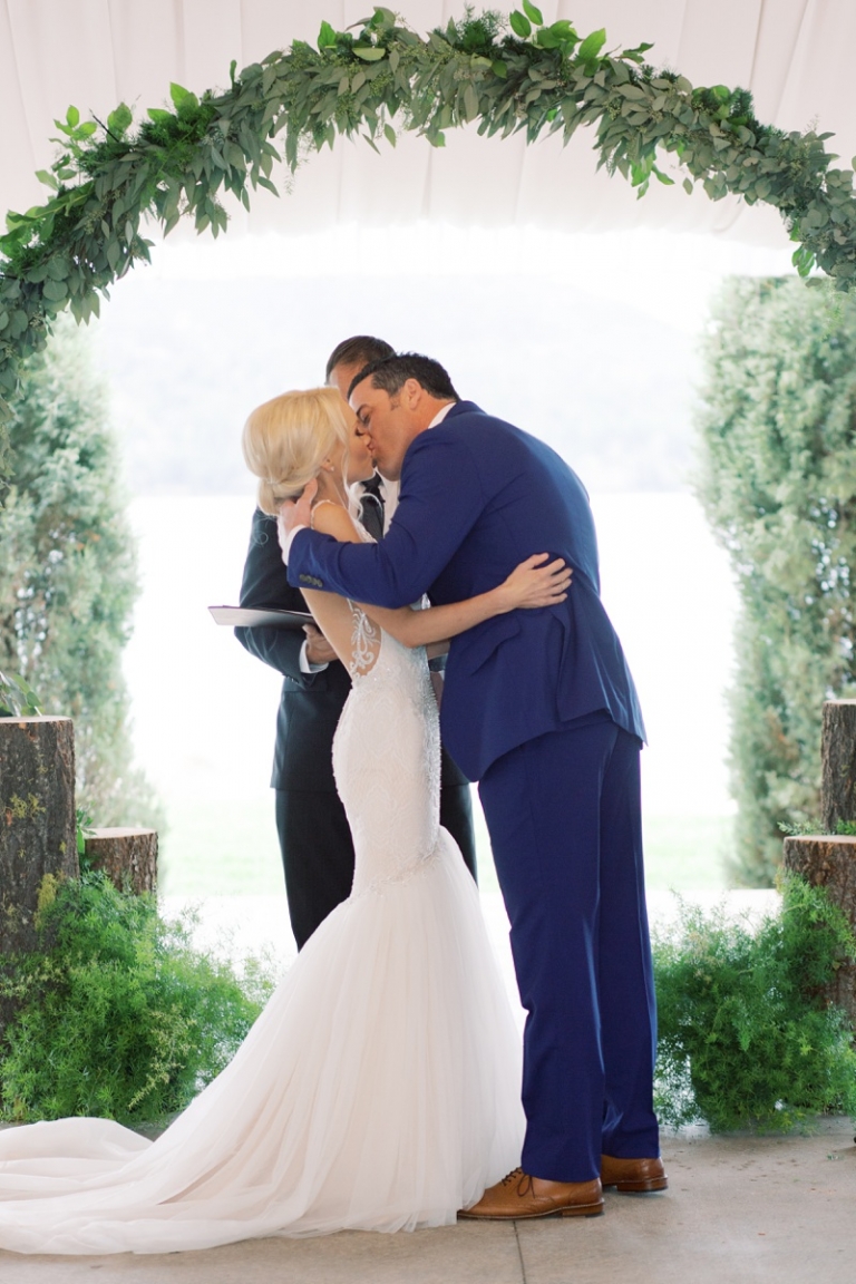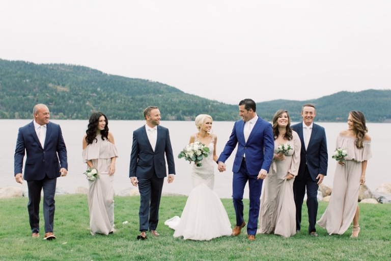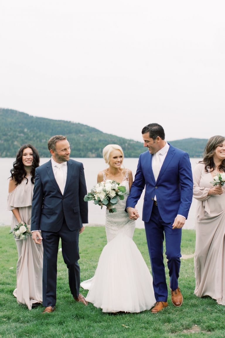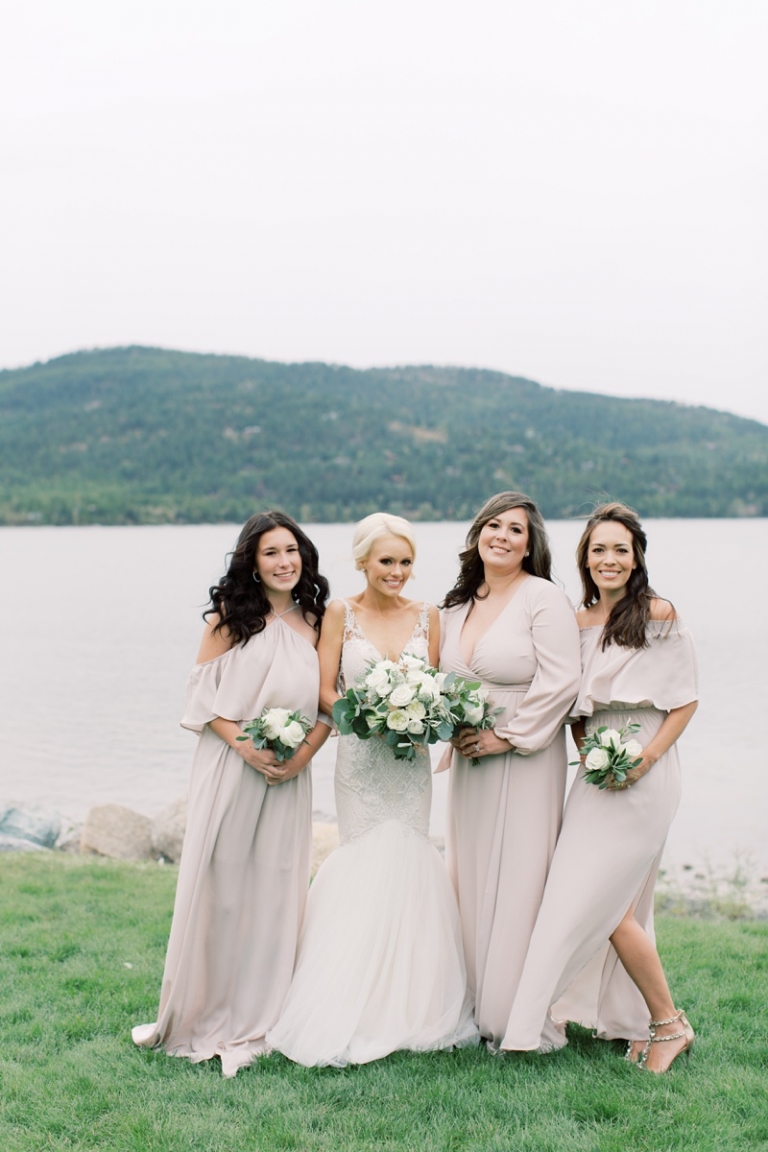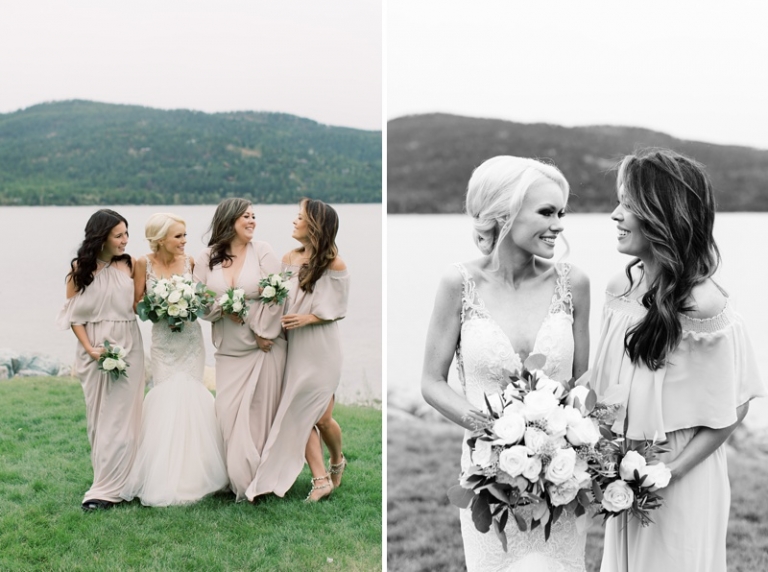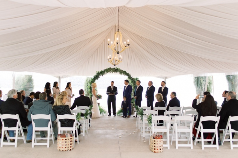 The couple were married in the beautifully canopied tent overlooking the lake’s shore and mountains. The bridesmaids looked beautiful in their neutral dresses and despite the cold, everyone rallied for photos outside.